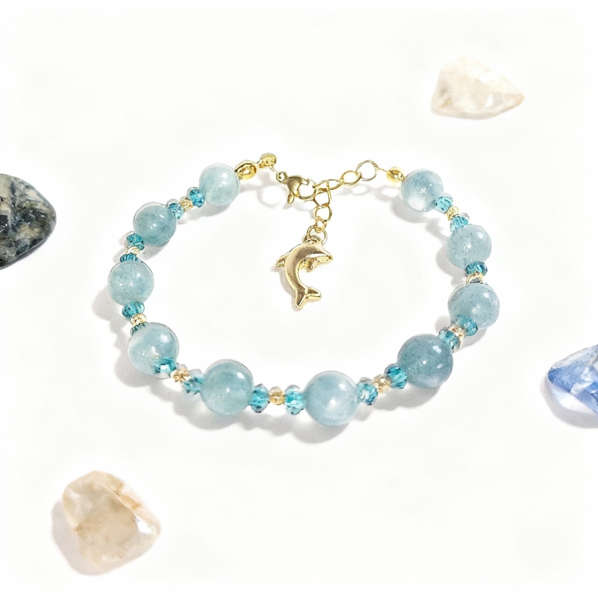 Doğanın berrak tonlarını taşıyan bu el yapımı bileklik, huzur taşı olarak bilinen akuamarin ile hazırlanmıştır. Zarif mavi kristaller ve altın detaylarla süslenmiş, şirin yunus figürüyle tamamlanmış bu tasarım, sadece bir adet olarak üretilmiştir.