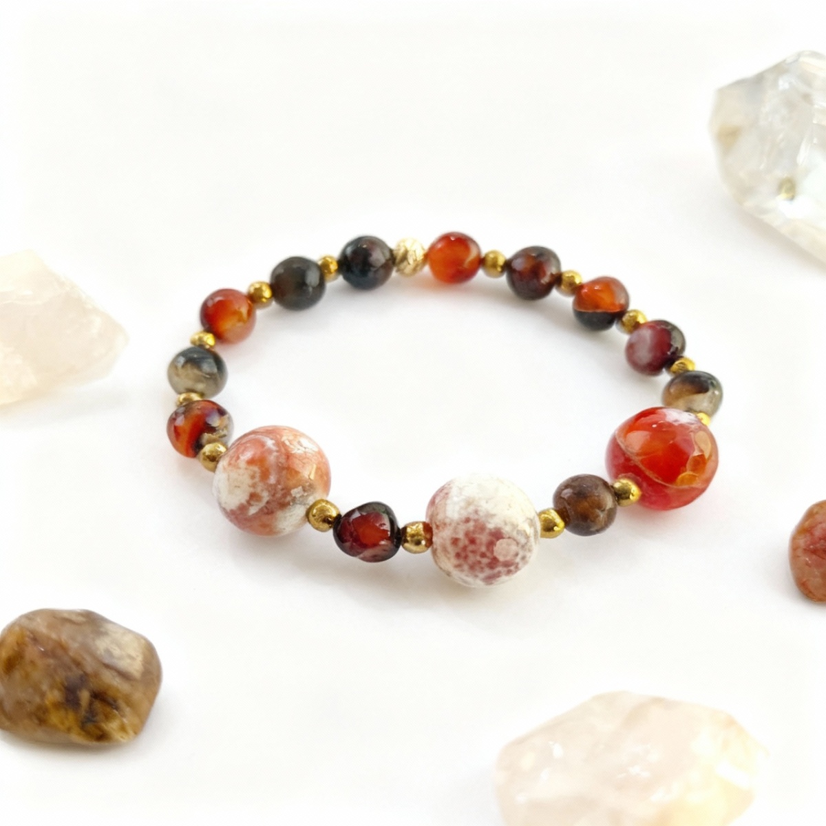 Akik ve hematit kombinasyonu, doğanın en güçlü topraklayıcı ve dengeleyici enerjilerini bir araya getirir. Akik'in çok renkli yapısı yaşamın farklı alanlarına denge getirirken, hematit'in metalik enerjisi güçlü bir koruma kalkanı oluşturur. Disk formundaki hematitler enerji akışını düzenlerken, farklı boyutlardaki akik taşları enerjiyi kademeli olarak yükseltir. Bu iki taşın birlikteliği, hem fiziksel hem de ruhsal dengeyi mükemmel şeki