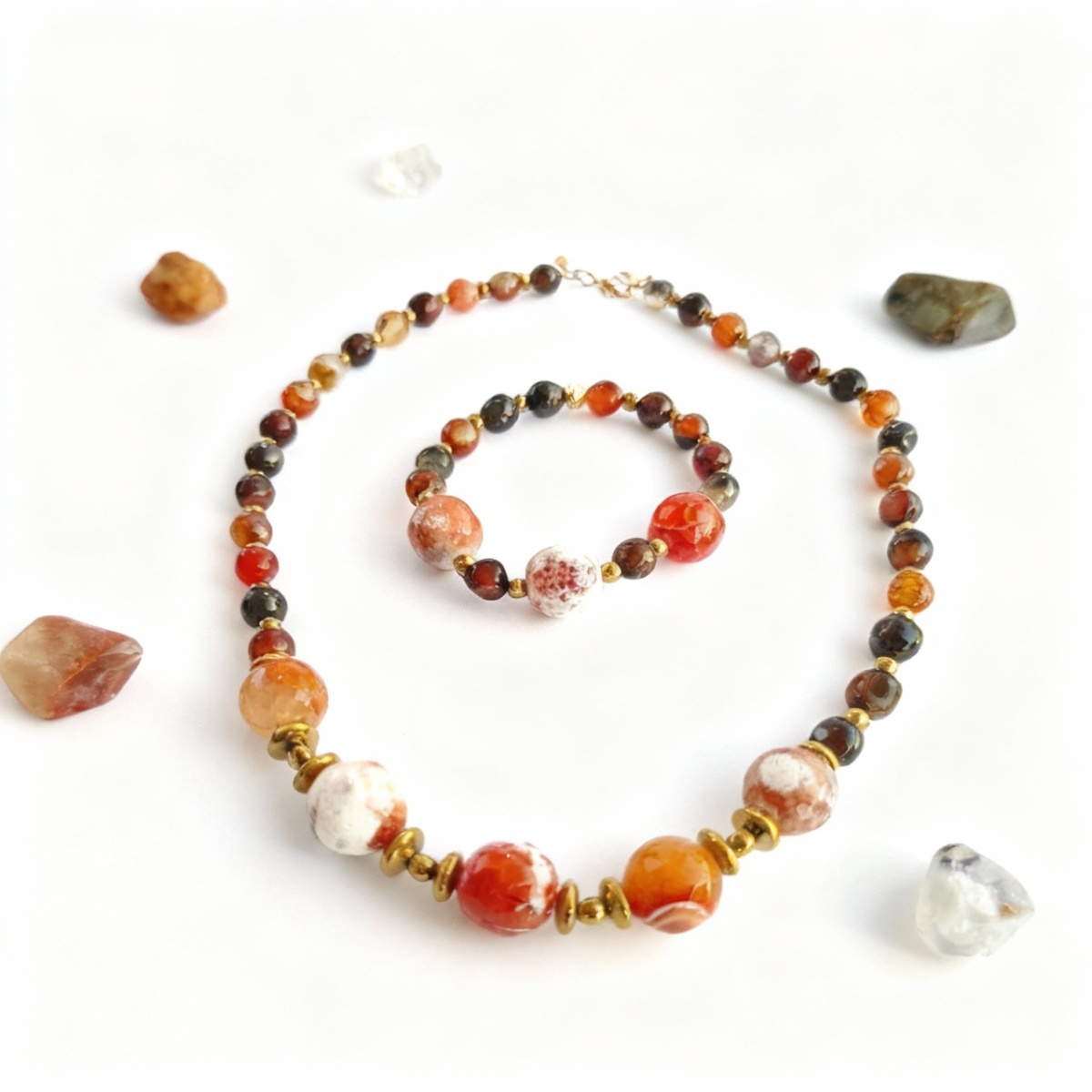 Topraklayıcı ve dengeleyici enerjileriyle bilinen bu doğal taş kombinasyonu, hayatınıza güç, denge ve koruma getirir. 48 cm kolye ve 17 cm bileklik ikilisi, cesur ve şık görünümüyle dikkat çeker.