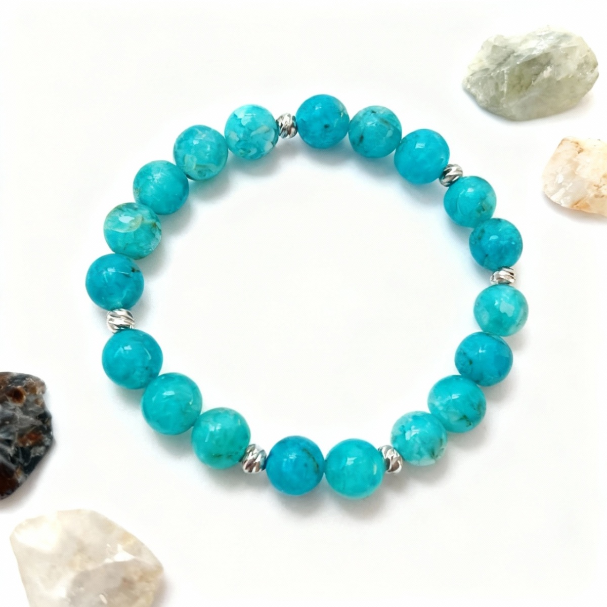 Bu zarif mavi akik bileklik, 8 mm boyutundaki özenle seçilmiş doğal mavi akik taşlarından el emeğiyle üretilmiştir. Turkuaz ve açık mavi tonlarındaki sakinleştirici renkleriyle göz alıcı akik taşları, gümüş renkli metal ara parçalarla birleştirilerek hem modern hem de zamansız bir tasarım oluşturulmuştur.