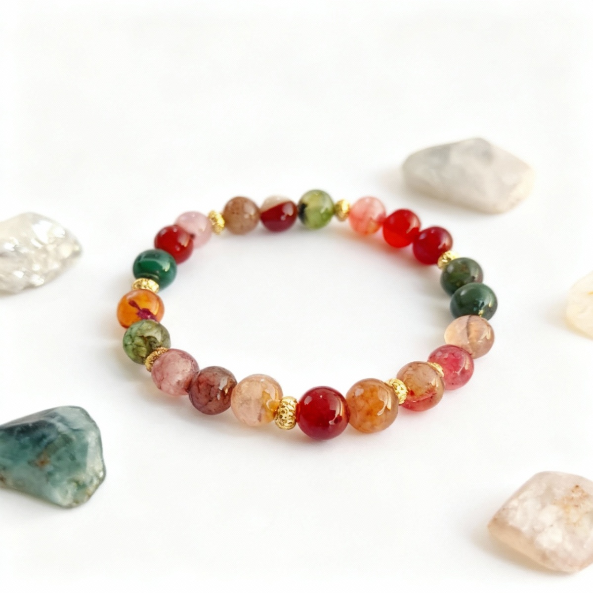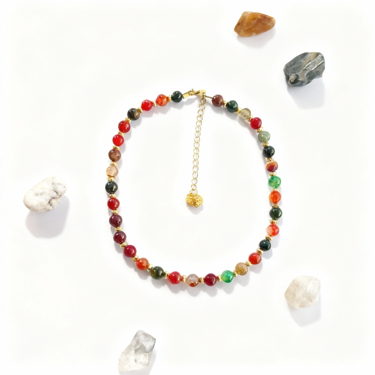 Renkli akik kombinasyonu, yaşamın tüm yönlerini kapsayan geniş bir enerji spektrumu sunar. Her renk farklı bir çakraya hitap eder: kırmızı kök çakra (güvenlik), turuncu sakral çakra (yaratıcılık), yeşil kalp çakra (sevgi), mor taç çakra (spiritüellik). Bu renklerin bir arada kullanımı, fiziksel, duygusal, zihinsel ve spiritüel tüm katmanlarda denge ve uyum yaratır. Altın renkli detaylar, bu enerjileri birleştirerek güneş enerjisi ve bolluk titreşimi katar. Özellikle hayatınızda genel bir denge arayışında olduğunuz dönemlerde güçlü bir destek sunar.