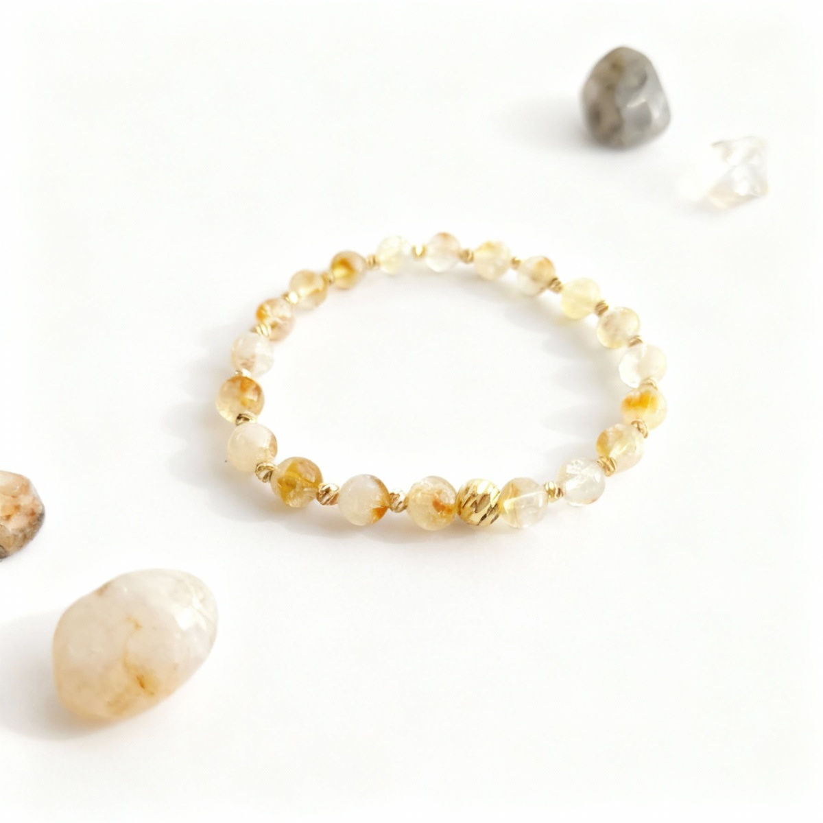 Bu ışıltılı sitrin bileklik, 6 mm boyutundaki özenle seçilmiş doğal sitrin taşlarından el emeğiyle üretilmiştir. Bal sarısı ve altın tonlarındaki berrak sitrin taşları, altın renkli metal ara parçalarla birleştirilerek hem zarif hem de enerjik bir tasarım oluşturulmuştur.